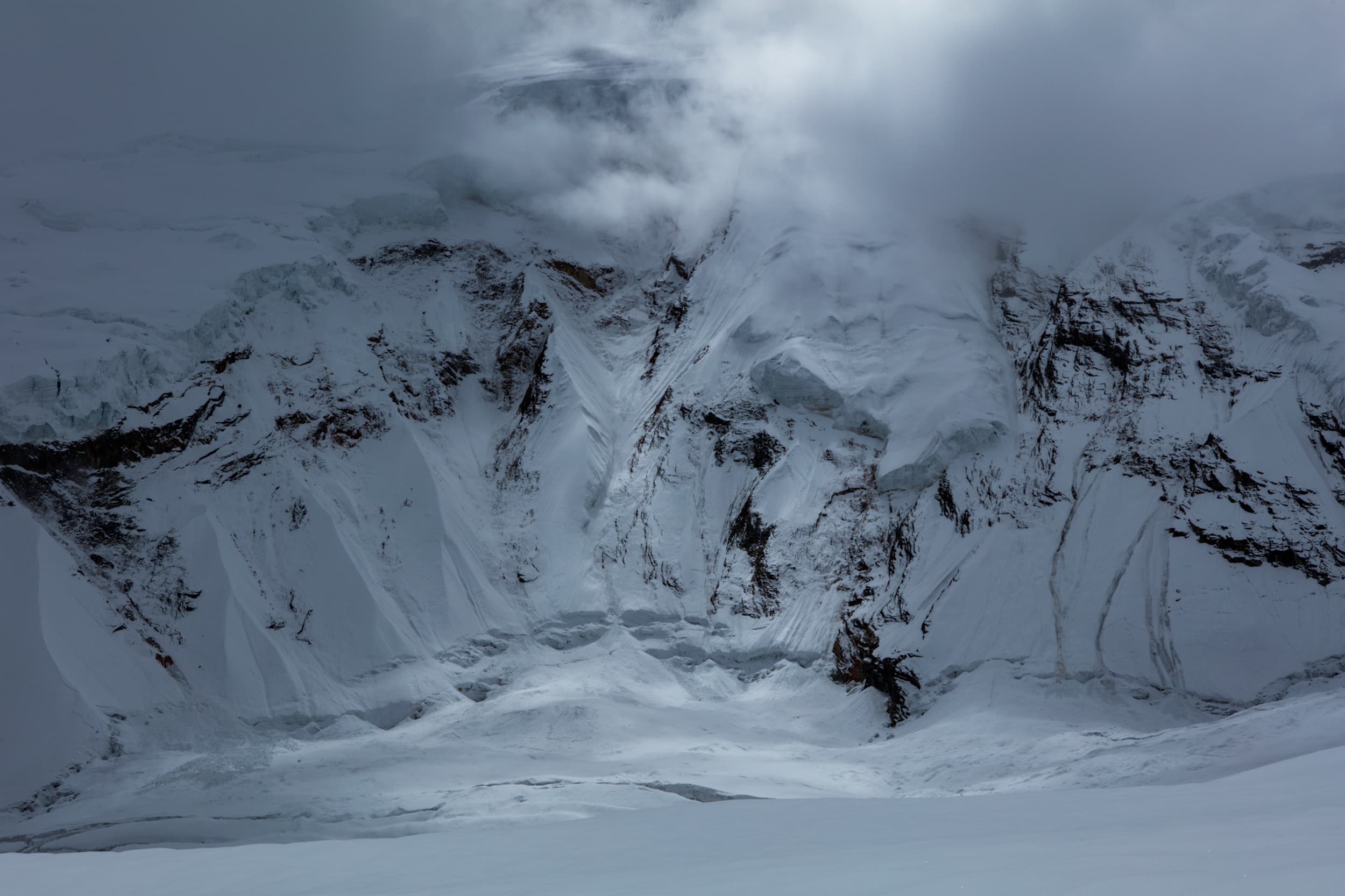 この時、キャンプ3はガスに覆われ、視界が全く効かず、すでに天気は崩れかかっていた。僕の体調も悪く、30分だけ滞在し、ベースキャンプへ急いで引き返すことにした。キャンプ2まで降りる頃には本格的に雪が降りはじめ、視界はさらに悪くなっていく。途中の氷壁は懸垂下降で降り、急ぎ足で下山したが、次第に日は沈み、真っ暗な中での帰還となった。