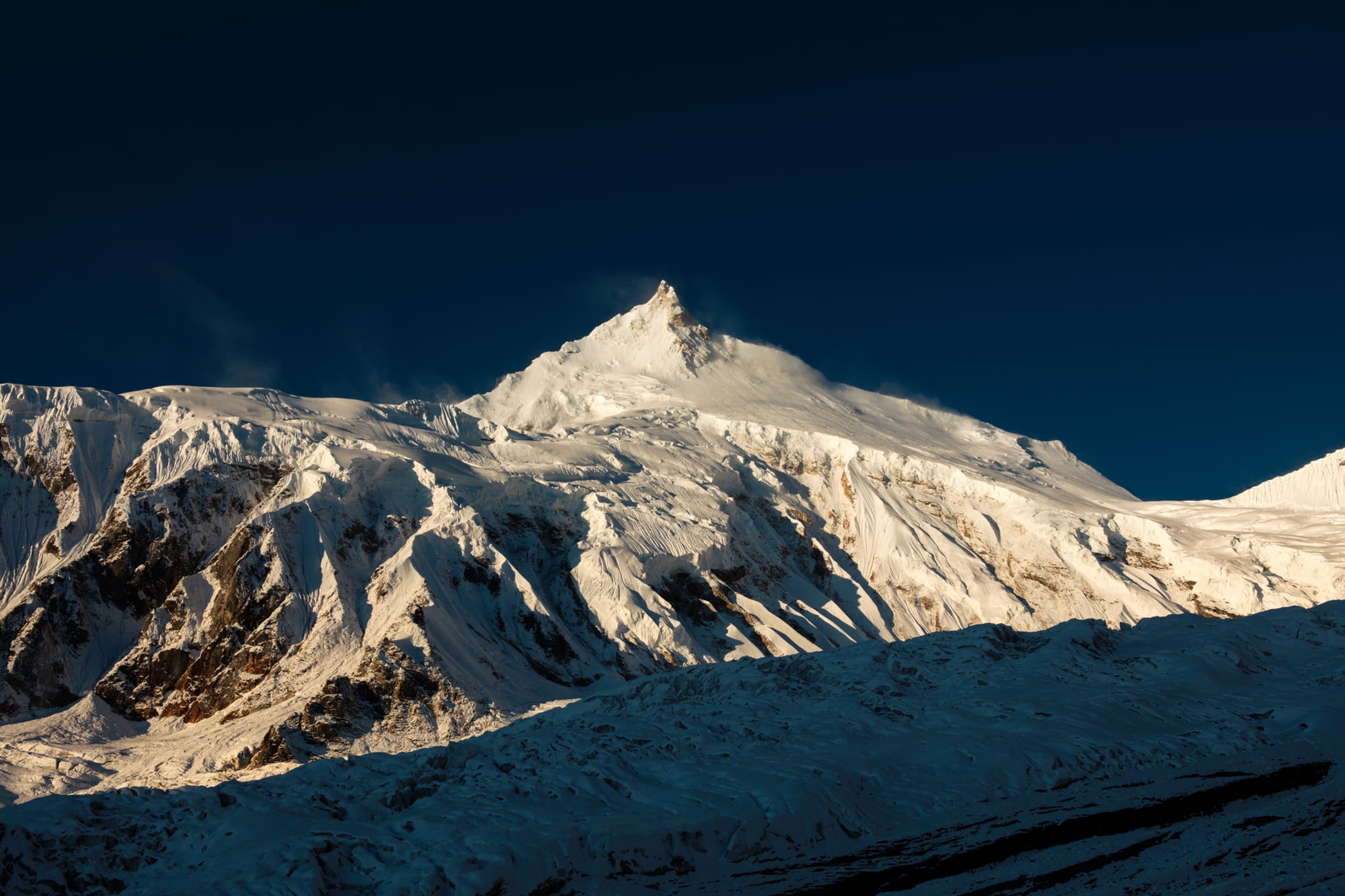 9月22日午前5時、目が覚めるとほのかに外が明るい。テントから出ると今まさに太陽が昇ろうとしているところだった。空に雲はなく、マナスルに少しずつ朝日が当たっていく。ろうそくの火のように山頂をオレンジ色に照らす光はゆっくりとマナスルの裾まで黄金に染めていった。ベースキャンプに来て3週間、はじめて目にした光のショーは息をのむほど美しいものだった。