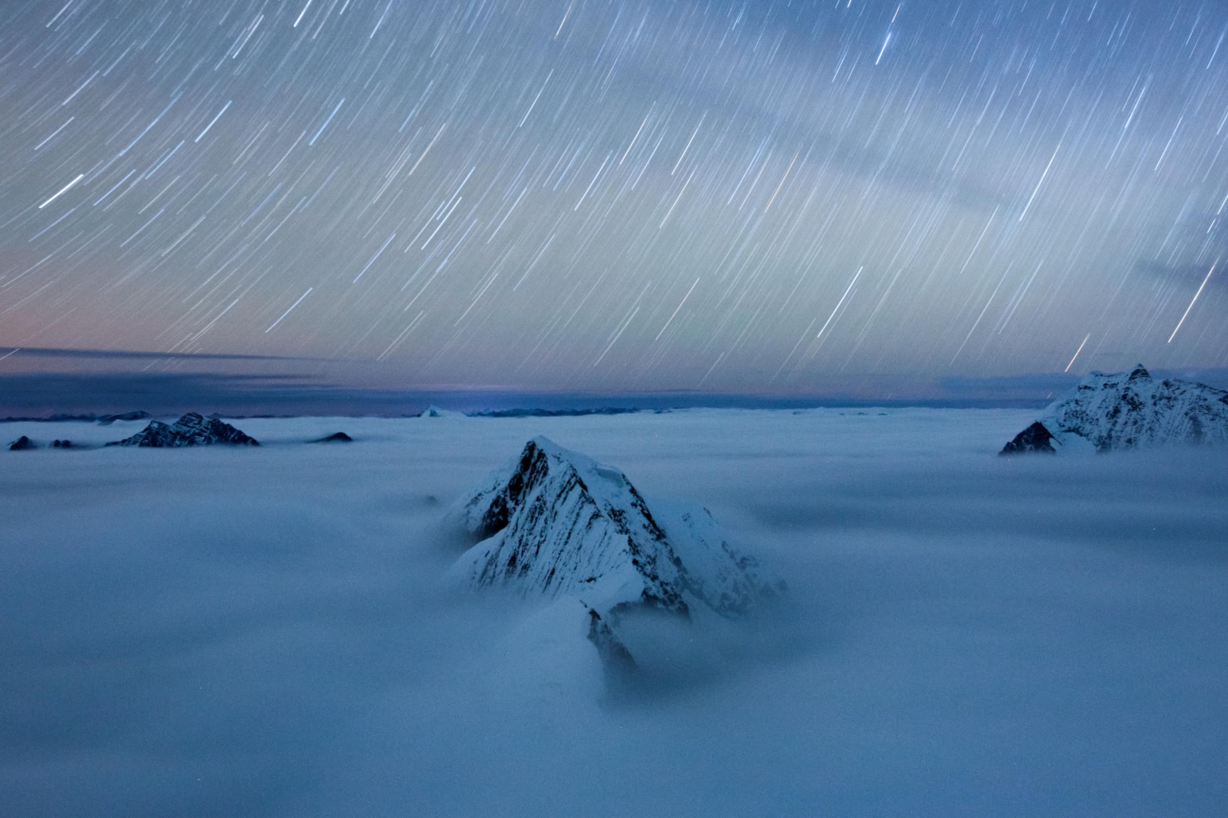 静寂に包まれ、たったひとりで神々の山と向かい合い、悠久の時間に想いを馳せる。今、僕が見ている風景は何万年、いや何億年と変わらない世界なのだろう。この山も、月も、風も、遠くから聞こえてくる雪崩の音も、遥か太古の時代からここにあり続けてきた世界が目の前に広がっている。まるでタイムスリップでもしたかのような不思議な感覚に、時間も忘れていつまでもたたずんでいた。
