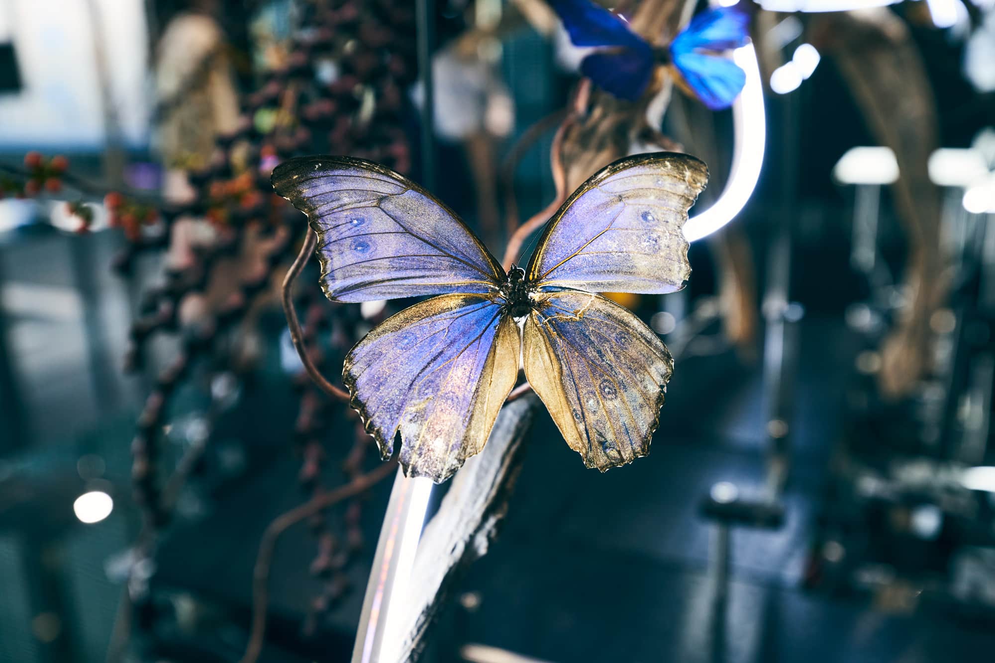 シンボル展示「計算機と自然」。人工物と自然物が融合したさまが表現されている。月替わりで華道家の辻 雄貴さんが生ける自然物の中に、印刷によって精巧に再現された蝶や、落ち葉を拾うロボットアームなどの人工物がひそむ。未来にあふれているかもしれない、自然と人工物が混在した世界を直感的に体感できるようになっている