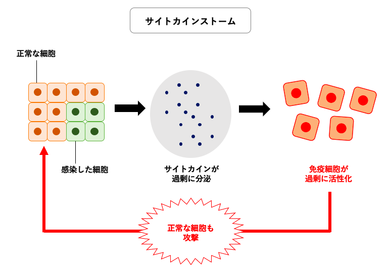 肺炎は、肺の中で炎症が起こる病気です。ウイルスに感染して炎症が起こると、ウイルスから体を守るために、肺組織の細胞からサイトカインという物質が放出されます。サイトカインは本来なら体の防御や恒常性の維持を担うはずなのですが、炎症が強くなると大量のサイトカインが出てしまい、免疫細胞が過剰に活性化して今度は自分の体を傷つけるようになってしまいます。これが「サイトカインストーム」と呼ばれる免疫機能が暴走した状態です。